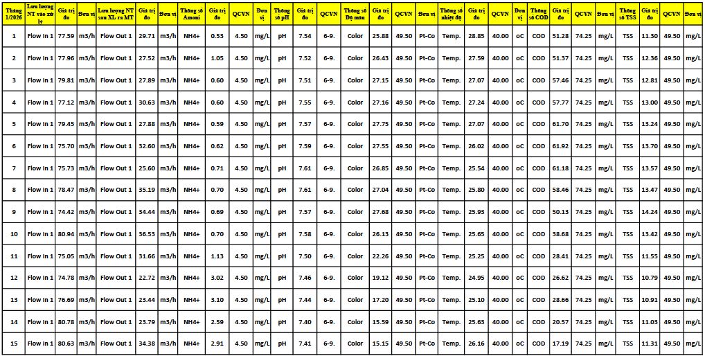 Giá trị quan trắc tự động Lần 1 – T1- 2026